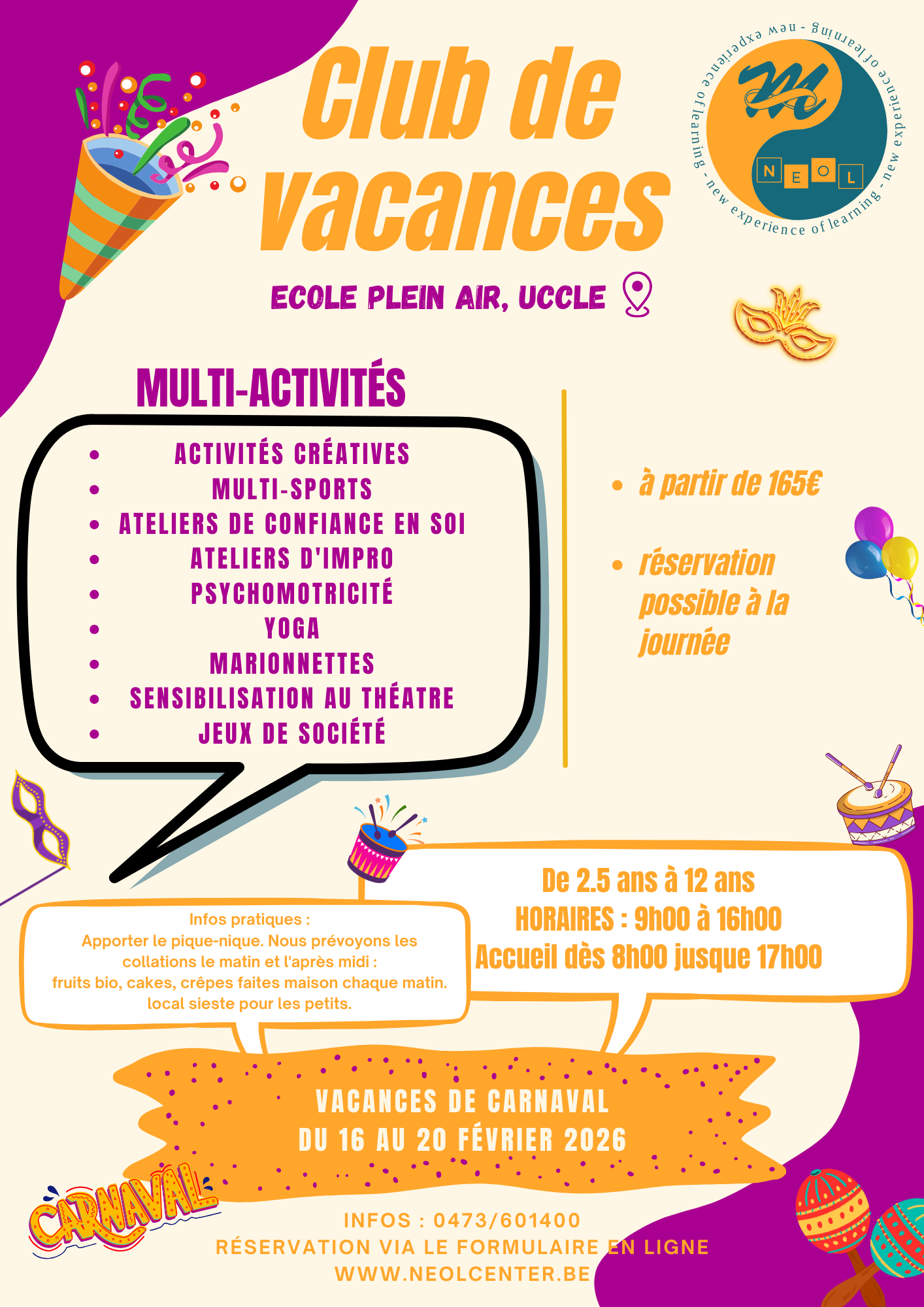 Une multitude d’activités hautes en couleur attendent vos enfants pour leur faire vivre des vacances inoubliables, rythmées par l’esprit festif et la créativité du Carnaval.